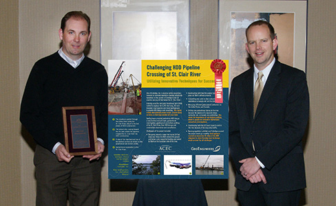 The American Council of Engineering Companies of Missouri (ACEC MO) has awarded GeoEngineers an Engineering Excellence Honor Award for the Challenging HDD Pipeline Crossing of the St. Clair River project. Springfield geotechnical group leader Jon Robison, PE and trenchless group leader Mark Miller, PE attended the ACEC MO Awards Banquet in Kansas City on February 16, where Mark accepted the award on behalf of GeoEngineers and our client, Enbridge, Inc.
