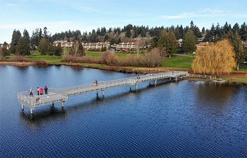 On Saturday, the City of Mountlake Terrace, Washington, held a ribbon-cutting ceremony to reopen Ballinger Park’s improved shoreline. With the only accessible shoreline in Mountlake Terrace, the park is popular with the community. The $1.5 million project renovated park amenities and replaced an aging wooden dock, used for both fishing and non-motorized boating, with a separate boat launch and 220-foot aluminum fishing pier.